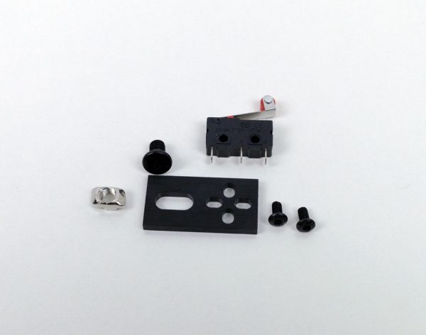 リミットスイッチそのままではV-slot,C-Beamに取り付けができないため、付属のプレートを使って本体フレームに固定します。フレーム組み立てに使用したM5ネジよりも小さなネジをプレートを貫通させながらリミットスイッチの穴にねじ込んで固定します。