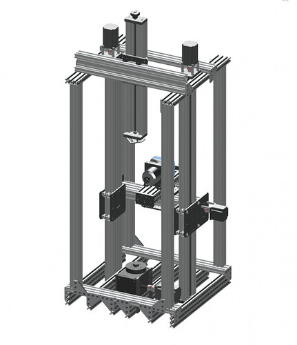 V-Slot リニアレール 2020銀 750mm×16、V-Slot リニアレール 2040銀 750mm×4、3wayキューブコネクタ×16、低頭ボルトM5 15mm×48で直方体形状のフレームを仮で組み立てます。