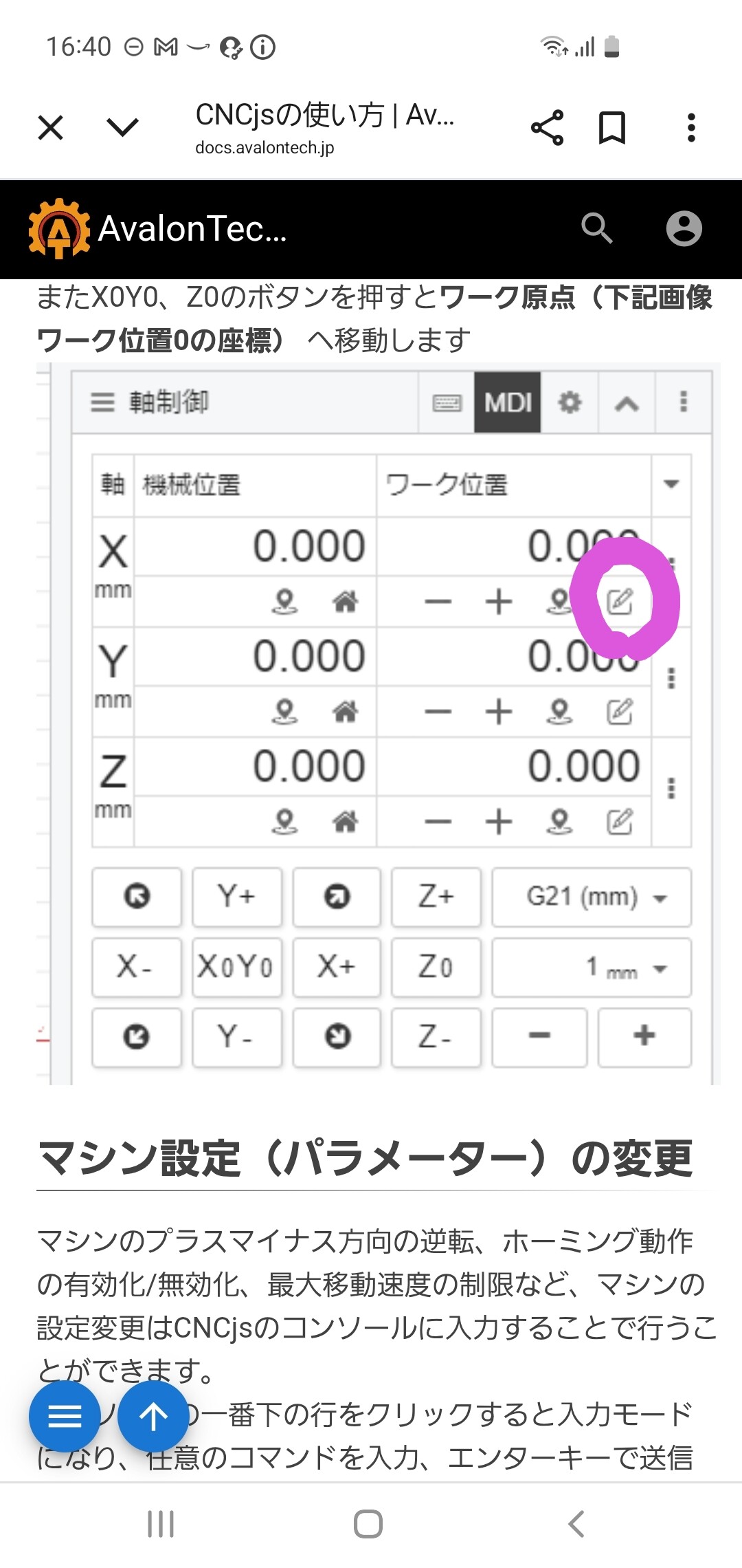 ワーク座標の欄に、+、-、0、の横にペンマークがあります。