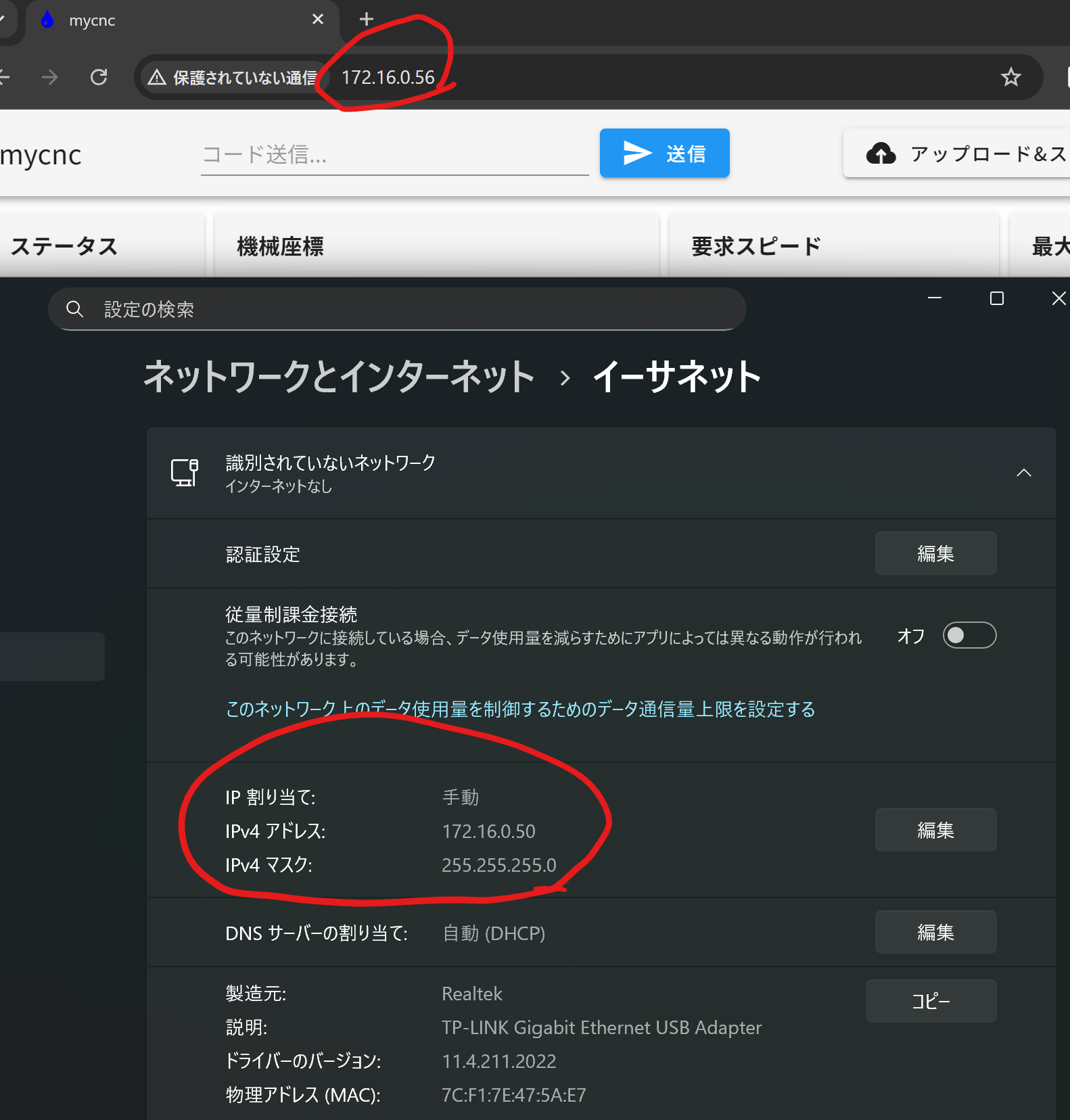 Duet3基板のLANポート付近では、緑と黄色のLEDが点灯しています(リンクは確立しているようです)。Duet3のSDカード内にconfig.gを編集し、IPアドレスを固定設定しています。PC側も同一セグメントのIPを設定済みです。しかし、WebブラウザからDuet Web Controlにアクセスしようとしても接続できません。