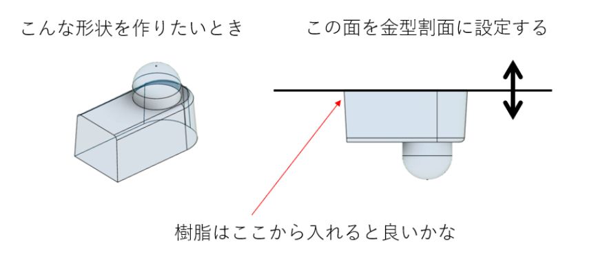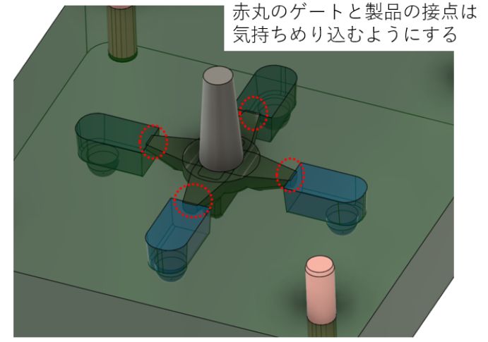 上図矢印のサイドゲートで樹脂を入れるイメージで考えました。