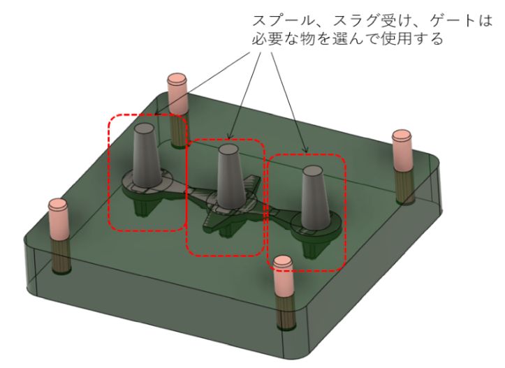 4個取りの配置としては、中央のスプールから4方向にゲートを付けて、